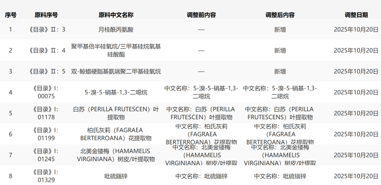 2025年10月20日,国家药品监督管理局发布了最新的已使用原料列表,对部分化妆品原料的名称进行了调整与规范,主要涉及成分的中英文名称修订,以便与国际命名标准保持一致并消除歧义。