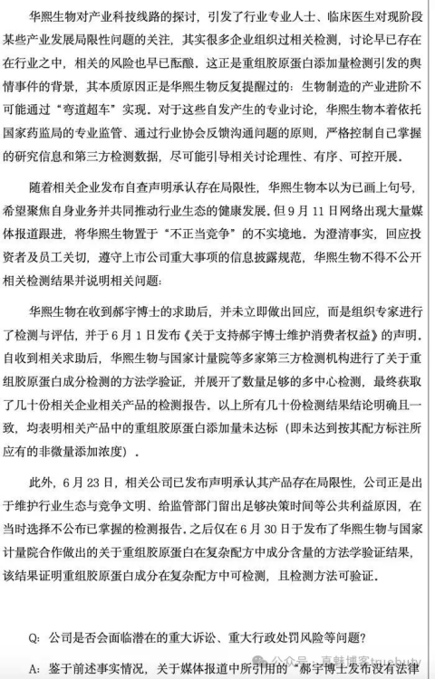 尽管存在这层间接联系,华熙生物依然坚称,公司因此面临的潜在重大诉讼或行政处罚风险“极小”,其底气在于“科学的数据不会说谎”。公司在交流中表达了强硬立场:“无论华熙生物与行业内的专业人士……是否存在直接或间接偏远的股权联系,都不改变检测数据的结果,不影响一个产品是否达到质量标准的科学认定,更不能构成阻碍监管及消费者知情权的借口。”