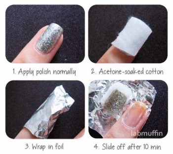 使用这个方法的话,涂甲油的时候挺省心的,但是卸甲的时候就会比较费力了。你需要把卸妆棉裁剪成和指甲一样的大小并在上面涂上丙酮或其他卸甲产品,将其盖在甲面上,然后用铝箔片把每个手指包起来。10分钟之后,打开铝箔你会发现大部分的甲油都附着到了卸妆棉上。如果需要的话可以重复操作,或者用卸妆棉的背面在此擦拭。