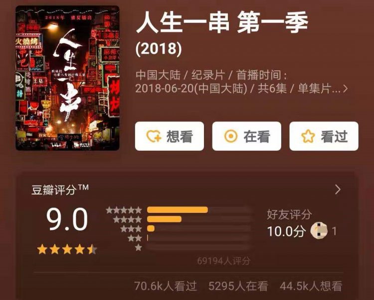 去年有部纪录片《人生一串》,豆瓣给出了9.0的高分。