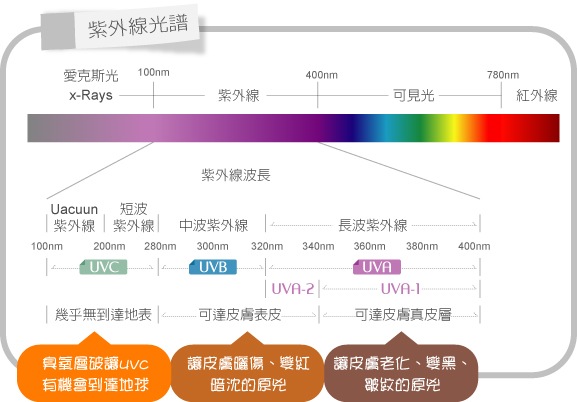 再来细看紫外线:紫外线分为UVC,UVB和UVA。UVC能量最高,但很幸运的,UVC是不能到达地球表面的,除非臭氧层破坏掉了。而UVB和UVA却能到达地表,对我们的肌肤造成伤害。UVB因为波长短,能量高,所以一经UVB晒过的皮肤,很容易引起即时的晒伤,经起脱皮,变红。而UVA能量不高,但并不意味着对皮肤没有伤害,UVA由于其波长较长的原因,更易进入皮肤皮肤深层。